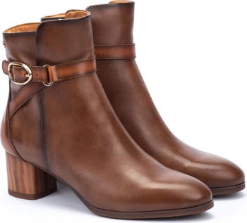 A slender buckle strap wraps around the shaft of a leather bootie balanced upon a study block heel.