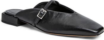 A notched topline and adjustable mary jane strap provide comfortable wear on an Italian-made leather mule featuring a slender square toe and streamlined profile.