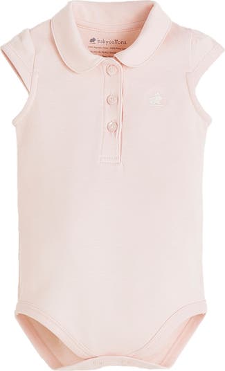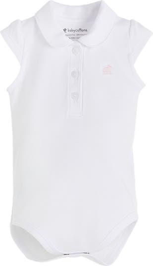 Short-sleeved smooth bodysuit made from ultra-soft Pima cotton. Features a classic polo neckline and subtle tone-on-tone button details on the chest. Designed for ease, it has snap buttons in the crotch for effortless diaper changes. A versatile and essential piece for everyday wear.