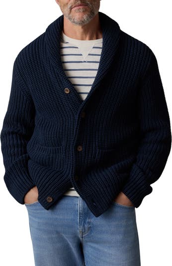 A cozy shawl collar enhances the warmth of this shaker-stitch cardigan knit with soft cotton yarns.