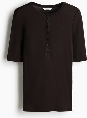 Fitted top in sheer pima cotton jersey with flatlock seams for added comfort. Round neckline, button placket and elbow-length, close-fitting sleeves.