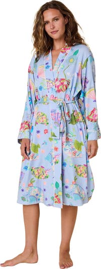 - This kimono-style robe has piping detail at neck edge. Perfect to pair with your favorite PJs!