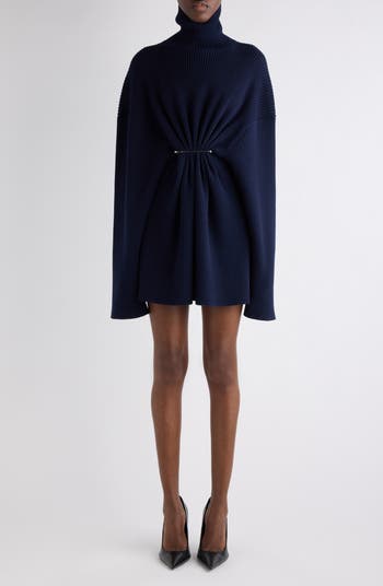 Featured on the label's fall '25 runway, this turtleneck minidress made from wool rib showcases an oversized silhouette with pinched gathers secured with a safety pin.