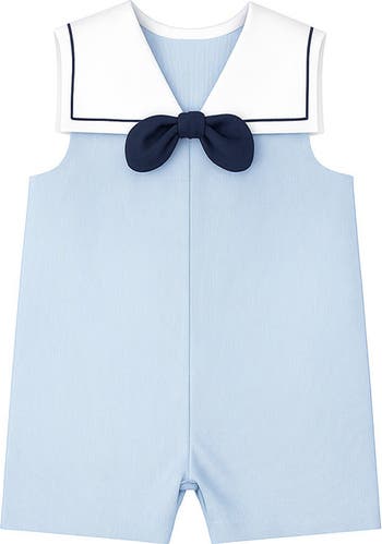 Classic and nautical, this shortall is crafted from soft blue pincord for a lightweight, vacation-ready feel. A traditional sailor collar adds timeless charm, while a back zipper and inseam snaps make dressing and changes easy for days spent exploring, playing, or creating lasting memories.
