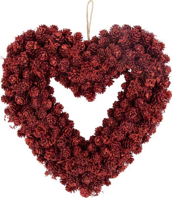 Make this Valentine's day extra special with a beautifully crafted red rose heart wreath. Made from wooden, rose-shaped pinecones and red preserved foliage, this wreath exudes elegance and charm. The wreath is further embellished with red glitter for a touch of sparkle. Designed with a flat back that can be easily laid on any surface as a centerpiece. You can also add a matching red ribbon to hang the wreath on your front door or above your mantel. Add a touch of love and warmth to your home this Valentine's Day with this rose heart wreath. Product Features: Deep red floral heart wreath Rose-shaped wooden pinecones formed into a heart Preserved red foliage intertwines through the pinecones Flat back design to lay flat as a centerpiece or snug against the wall Add a decorative rope for hanging, as it is not included Handle with care Recommended for indoor use - if using outdoors place under a covered area No assembly required - wreath comes in 1 piece Dimensions: 14"H x 14"W x 3"D Material(s): wood/foam