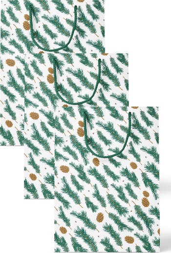 Elevate your gift wrapping with natural holiday charm. This Pine Pattern Gift Bag Set of 3 features an elegant design of green pine branches and pinecones against a crisp white background. Perfect for Christmas gifting or winter celebrations, these bags are crafted with scuff-resistant matte lamination and heavyweight paper stock for durability and reuse. A timeless and festive choice to make your presents feel extra special.