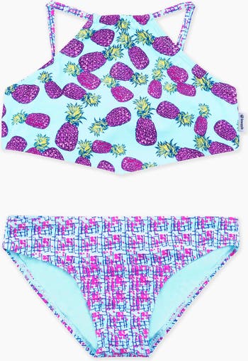 A bright halter tankini swimsuit with an allover pineapple suit in contrasting colors