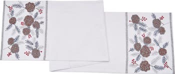 The Pinecone & Berries table runner is the perfect way to add some seasonal cheer to your holiday or winter decor. The white background highlights the shades of grey pine needles and cones, outlined in brown, with the occasional pop of red berry to add a touch of festive flair. It's casual yet elegant, making it an excellent addition to any tabletop.