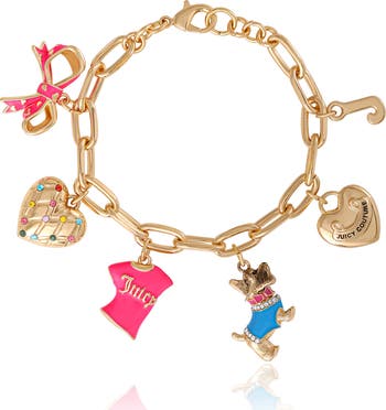 Make a bold fashion statement with this gold-tone charm bracelet featuring Juicy Couture's signature symbols: a glittering heart, a chic pink bow, a sparkly blue pup, and more. Playful and feminine, this bracelet adds fun to any outfit.
