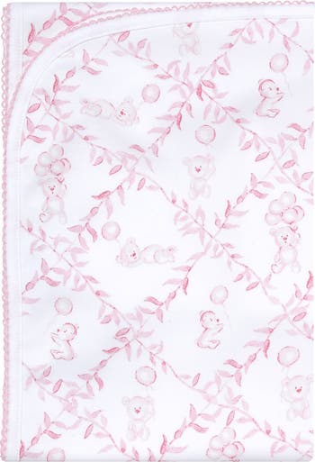 This cute baby blanket comes in pink picot trim details with a detailed bear imprinted design. Made with 100% Peruvian Pima cotton fiber, makes this blanket more moisture-wicking, breathable, and durable. The properties of this fiber create a more durable fabric that gives our clothes that unparalleled luxurious touch that is so highly desired. Measures: 29 inches x 32 inches 100% Pima Cotton Machine washable Made in Perú *This beautiful print has come to life thanks to Pearly Gates Designs.