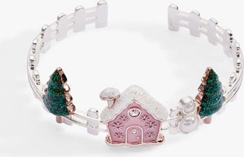 Celebrate the magic of the holiday season with this playful Gingerbread House Cuff. It showcases a whimsical picket fence design that wraps around your wrist, highlighting a sweet enamel gingerbread house sparkling with stone accents. Enamel pine trees add a splash of evergreen charm, while a pearl snowman brings a touch of frosty fun. Perfect for adding a festive and merry touch to any outfit, this cuff captures the cozy spirit of winter in a fun, wearable form.