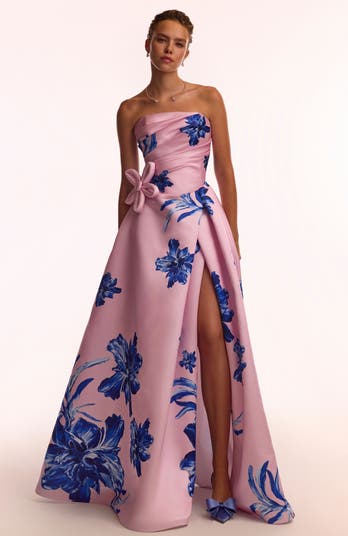 Expressive yet balanced, this strapless pink maxi dress features bold blue florals set against a fluid A-line silhouette. The softly draped bodice enhances the waist, while the flowing skirt with a front slit introduces confident movement and shape. Designed for formal wear and elevated occasion styling, this floral maxi dress is ideal for galas, celebrations, and standout evening events.