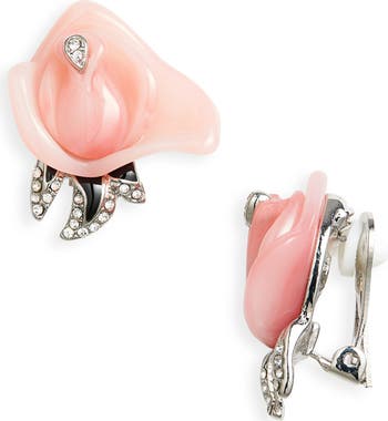 Pink Flower & Black Leaves Clip-On Earrings