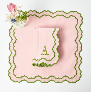 Our lovely Lily Pink and Green Napkins are perfect for a pretty Easter table. A scalloped petal border in apple green prettily frames the soft pink linen.We offer the option to personally bespoke your napkins with our Mrs. Alice monogram service. If you would like to opt for this, please enter up to 2 initials in the box provided. Please allow an extra 10 days from the time of your order for monogramming.