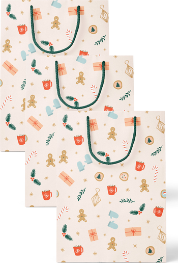 Add a playful pop of color to your holiday gifting. The Pink Holiday Pattern Gift Bag Set of 3 features a cheerful mix of festive icons in a modern pink palette—perfect for wrapping holiday surprises with style and charm. Crafted with scuff-resistant matte lamination and heavyweight paper stock, these bags are sturdy, reusable, and designed to make every gift feel extra special.