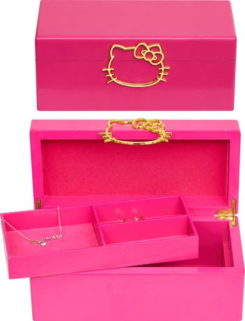 - Officially licensed Sanrio merchandise inspired by Hello Kitty Super cute pink wooden jewelry organizer features a golden Hello Kitty icon handle with a removeable inner tray and luxurious ultra suede inner lining Hello Kitty jewelry box measures 10" x 2" x 5" and is ideal for rings, earrings, necklaces, bracelets and anklets Gift idea Hello Kitty fans will love on any occasion including Bridal, Valentine's Day, Christmas, Mother's Day, Birthdays, Easter or just because