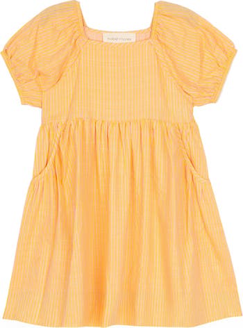 Brighten her wardrobe with this cheerful orange and yellow striped patterned dress. This dress also features short puff sleeves and a gathered waist and side pockets. Perfect for sunny days and playful outings. Fabric Care & Content Machine Wash Cold | Line Dry | Do Not Bleach 65% Cotton 35% Viscose