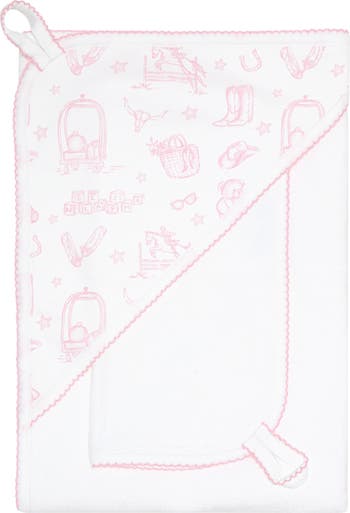 Make bath time extra special with this Texas-themed towel made of premium cotton. Soft, absorbent, and perfectly sized, it keeps baby warm and dry while showcasing playful illustrations of cowboys, boots, and teddy bears. Finished with elegant picot trim, it’s a functional piece full of personality.