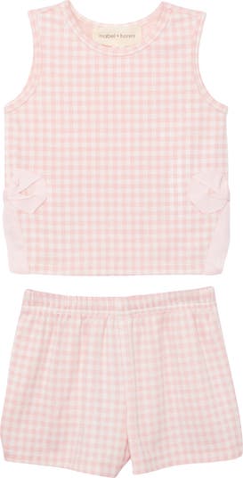 This light pink and white gingham two-piece set includes a sleeveless top with a rounded neckline, decorative pink bows on side panels, and matching elastic-waist shorts. The soft fabric ensures comfort, while the gingham pattern adds a timeless touch. Perfect for warm-weather outings or casual playdates, this outfit combines style and practicality for your little one.