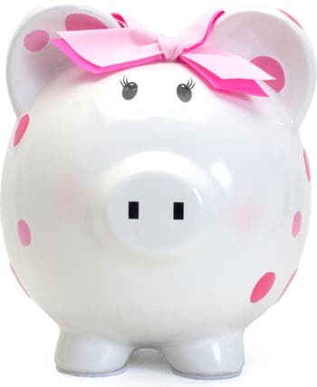 Teach them the art of saving up with this ceramic piggy bank painted with an adorable polka-dot pattern and topped by a sweet bow.