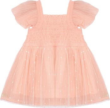 - This girls' dress in a soft peach hue features a lightweight fabric with a delicate dotted tulle overlay. The smocked bodice provides a comfortable fit, while fluttery puff sleeves add a touch of elegance. A flowy, gathered skirt creates an airy silhouette, making it perfect for effortless movement and style. Fabric Care 80% TENCEL 20% NYLON / 100% POLYESTER Machine Wash Cold