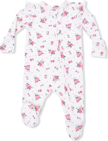 Pretty pink rosettes pattern this supersoft foot designed with a convenient two-way front-zip closure. Foldover cuffs ensure little hands are protected from accidental scratches.