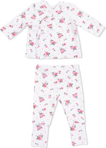 Soft rosettes pattern this two-piece set featuring a snap-closure long-sleeve shirt paired with matching pants.