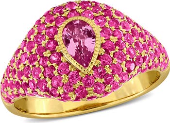 Make a bold statement with the dazzling Cocktail Ring. This striking ring showcases a vibrant pear-cut pink sapphire paired with dark pink sapphire accents set in luxurious 14k yellow gold. The pink sapphires royal, hues complement the richness of the gold setting, creating a piece that exudes elegance and charm. Perfect for special occasions or as a unique addition to your collection, this cocktail ring captures attention with its vibrant color and timeless design.