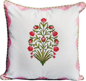 With a whimsical, wavy scallop border and a lovely floral centerpiece, this pillow is a vibrant addition to the home. Expertly block-printed by an eighth generation family of artisans in Jaipur, the artisans are stewards of a craft that has been passed down to them generation after generation. From the master block makers who carve the blocks in a village to the hands that print the cloth, there are many hands that go into making each piece. By selecting this handmade piece, you contribute to reviving craft and supporting artisan communities. Thank you for supporting our artisans. Material: 100% Cotton Dimensions: 18" x 18" inches