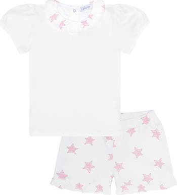An amazing blend of comfort and style for your little one! This set features soft pink shorts adorned with playful stars, perfectly paired with a white top that boasts a ruffle neck with the same star print.
