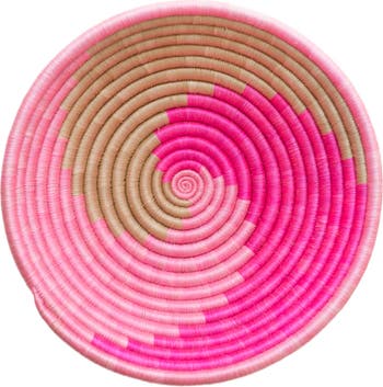 One of our best-selling signature plateaus baskets made in Rwanda with a one-of-a-kind handwoven design. 12" W x 3" H Available in Pink Made from strands of sisal wrapped around bunches of sweetgrass Includes a loop on the back for hanging Made from locally sourced fibers The ideal housewarming gift and the perfect shape and size to be used as a fruit basket, hung in a cluster on a gallery wall, or simply placed as an accent piece in your favorite nook around the house or office.