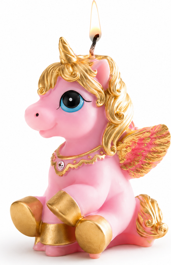 A pink unicorn candle designed for cake decoration, party décor and gifting, featuring a sculpted unicorn shape with playful detail and a whimsical finish. Hand-poured in soy wax, this novelty candle adds a lighthearted touch to birthdays, celebrations and themed events. Whether used as a cake topper or displayed as décor, it brings a fun, fairy tale-inspired accent to any setting.
