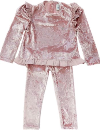 Featuring a luxuriously soft pink velour material, satin ruffle trim and shoulders, long sleeves, and pants-legging style