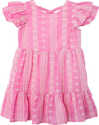This vibrant pink dress features delicate white embroidery. Designed with flutter sleeves, a tiered skirt, and a criss-cross back detail, it offers a playful yet elegant look. The lightweight fabric ensures comfort, while the gathered waist and ruffled hem add volume and movement, making it perfect for warm-weather outings. Fabric Care & Content Machine Wash Cold | Line Dry | Do Not Bleach 70% Polyester 30% Cotton Lining: 100% Polyester
