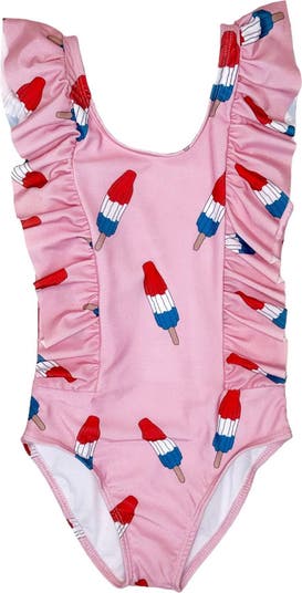 Adorable pink one-piece featuring a playful bomb pop print for ultimate popsicle party vibes. Scoop back and stretchy, quick-dry fabric keeps it comfy from poolside lounging to wave chasing.