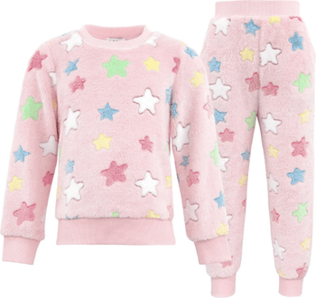 Features a soft pink base sprinkled with vibrant 3D star patterns in rainbow hues Made with an ultra-fuzzy fabric that feels dreamy against the skin all day Ribbed cuffs and waistband offer a snug, flexible fit for active play or casual wear