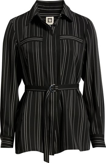 A tie at the waist creates a polished presentation in a button-up tunic punctuated with neat pinstripes.