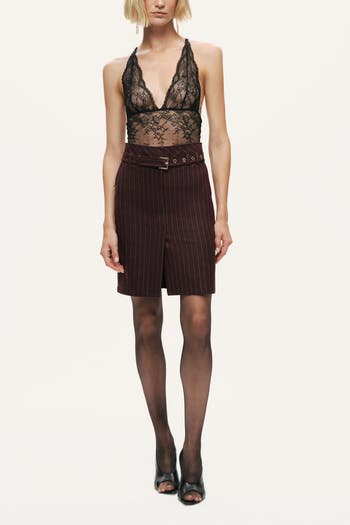 A sleek wardrobe essential crafted from woven pinstripe suiting. Designed in a slim, high-waist silhouette, it features a detachable belt with eyelets and a metal buckle for a refined, structured finish. Belt loops, a clean concealed zip, and a front slit add ease and movement, while the knee-length hem keeps the look polished. Fully lined for a smooth, comfortable fit.