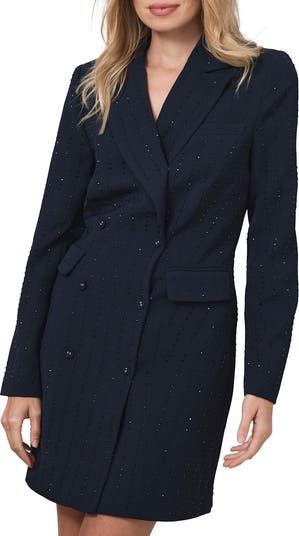 Blazer dress in a mini silhouette featuring peaked lapels, long sleeves, buttoned cuffs, flap pockets with a double breasted fastening through the front.