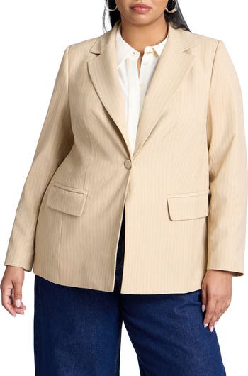 Classy pinstripes add sophisticated drama to this dapper single-breasted blazer that's cut from smart suiting-inspired fabric with comfortable stretch.