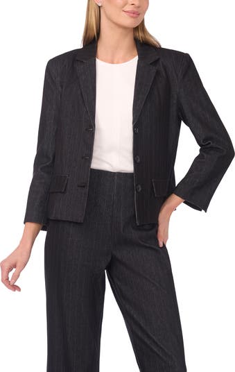 Padded shoulders give a strong silhouette to this stretch-kissed blazer covered in polished pin-thin stripes.
