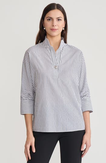Refresh your wardrobe with the Pinstripe Dolman Sleeve Cotton Blouse, a timeless piece that marries classic style with modern comfort. Featuring a stand collar, V-neck, and 3/4-length dolman sleeves, it offers a relaxed yet polished silhouette. Designed as a pullover, this blouse is perfect for casual days or effortlessly chic workwear.