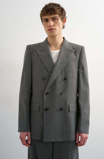 Classic pinstripes and a sharp double-breasted silhouette emphasize the suiting-style polish of this boxy sport coat framed by crisply peaked lapels.