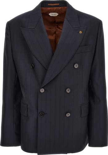 The '80s-throwback vibes echo throughout Dario Vitale's spring '26 collection, referencing Gianni Versace's early aesthetic, and this runway-featured blazer takes its place in the fashion pantheon tailored in a neatly pinstriped, uniquely double-breasted silhouette set with a Medusa lapel pin.