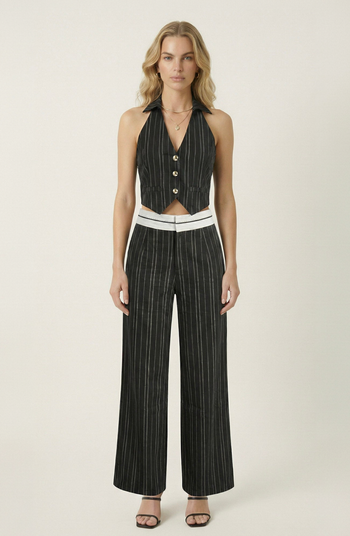 This two-piece set is crafted from a structured pinstripe fabric that delivers a sharp, tailored silhouette with modern edge. The halter vest features a pointed hem, notched collar detail, and statement buttons for a refined, menswear-inspired finish. Coordinating high-rise pants fall into elongated wide legs, creating a sleek, streamlined shape. Wear the set together for a polished power look or style each piece separately for versatile, elevated dressing.