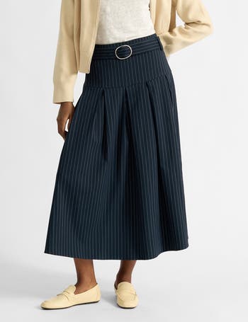 A best selling skirt updated in a pinstripe. Designed with a dropped waist and structured pleats for a flattering silhouette. Finished off with a self belt and side split.