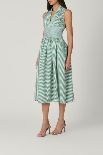 Chic cotton midi dress made in striped poplin fabric. This style features pleating around the neckband, a V-neckline, and a ruched waistband. The skirt is cut on the bias to form a chevron pattern with the stripes. Smocking at the back waist for a smooth fit.