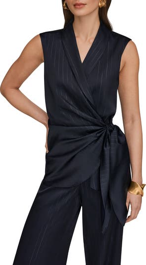 Silvery stripes elevate this tailored wrap-front top made in a sleeveless silhouette and finished with a drapey side tie.
