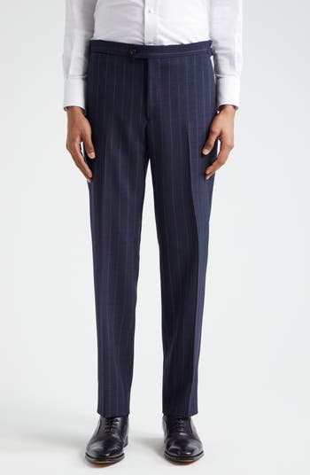 Pinstripes point up the precision tailoring of this structured suit cut from sumptuous wool in a single-breasted silhouette and framed with wide peaked lapels.