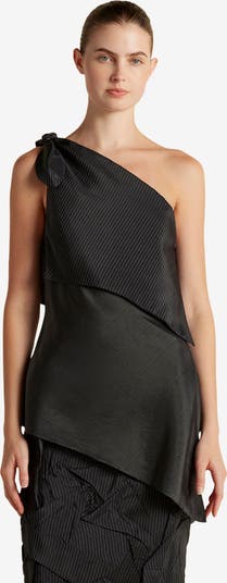 An asymmetrical neckline an single shoulder add a unique touch to this statement top. Draped on the bias, this versatile top skims over the body with a subtle relaxed fit. Pair with the Crushed Pinstripe Parachute Trouser or Tubino.